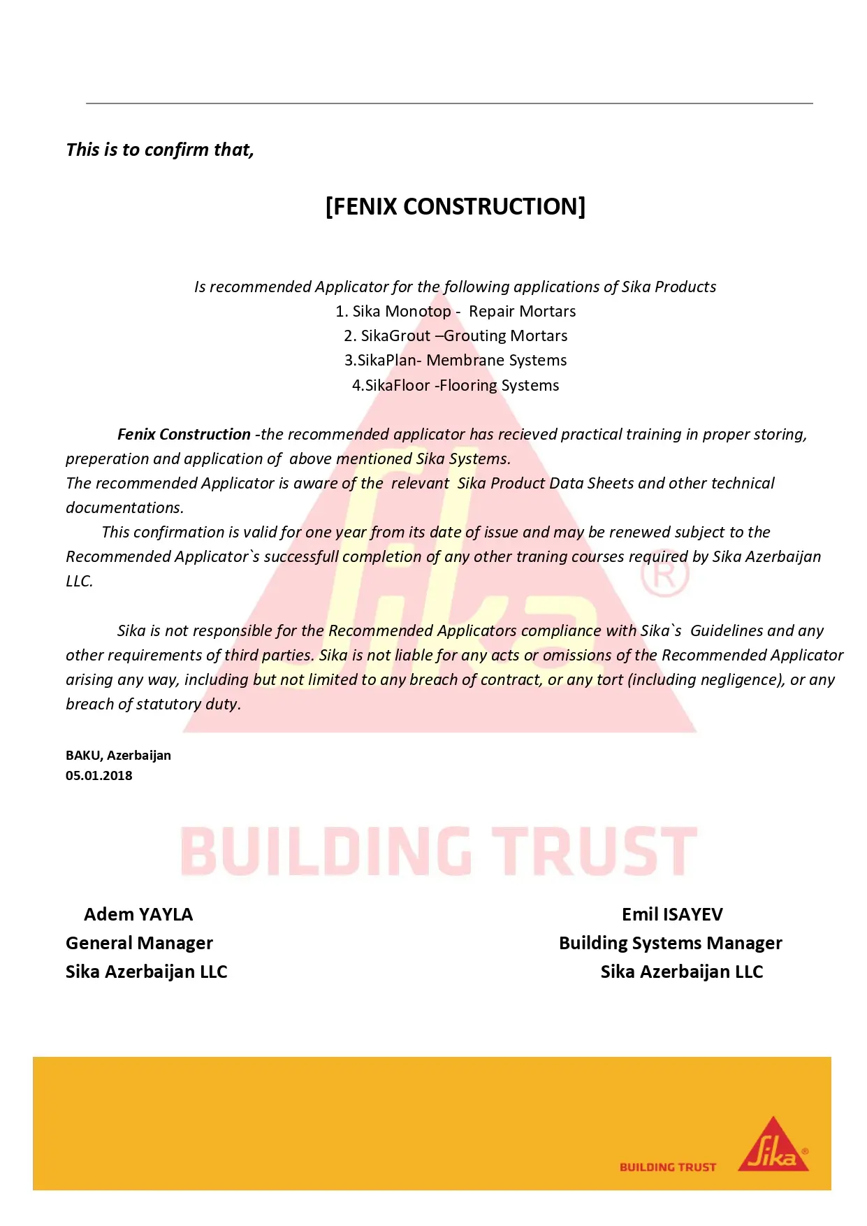 2009-cu ildən inşaat sektorunda fəaliyətlərinə başlayan Fenix Construction MMC şirkəti bu günə qədər istər xidmət keyfiyyəti, istərsə də müştəri məmnuniyyətinə verdiyi önəmlə, bu gün sektorun əsas qurumlarından birinə çevrilmişdir.